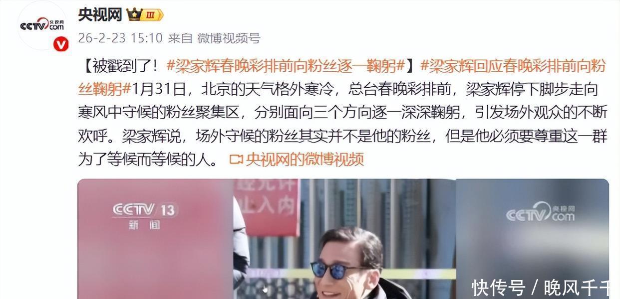2026号下:10,央视网发布消息:【被戳到了!#梁家辉春晚彩排前向粉丝逐一鞠躬#】#梁家辉回应春晚彩排前向粉丝鞠躬#1日,北京的天气格外寒冷,总台春晚彩排前,梁家辉停下脚步走向寒风中守候的粉丝聚集区,分别面向三个方向逐一深深鞠躬,引发场外观众的不断欢呼。梁家辉说,场外守候的粉丝其实并不是他的粉丝,但是他必须要尊重这一群为了等候而等候的人。