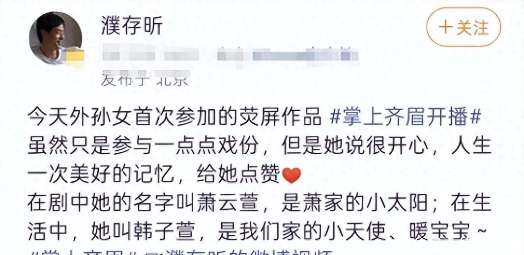 ?????? 事件源日,24集古装奇幻爱情短剧《掌上齐眉》登陆腾讯视频,讲述家族情仇与情感羁绊。开播当日,濮存昕便发动态道贺,附外孙女剧照尽显外公慈爱。次日他再发两条补充,称韩子萱仅“客串少量戏份”,只为留存成长印记。?????? 寻常长辈为晚辈助力本是常情,可网友并不买账,评论区从祝福急转吐槽。有人质疑,一贯低调的濮存昕此举酷似“资源咖运作”;更有人直指韩子萱颜值,“这条件进圈必遭非议”。深耕演艺圈数十年的濮存昕,怕是难遭这般密集恶评。